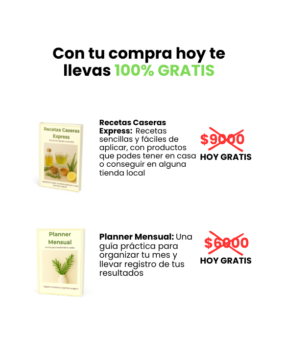 - Ebook Premium: +70 páginas con recetas caseras, nutrición y rutinas de autocuidado.